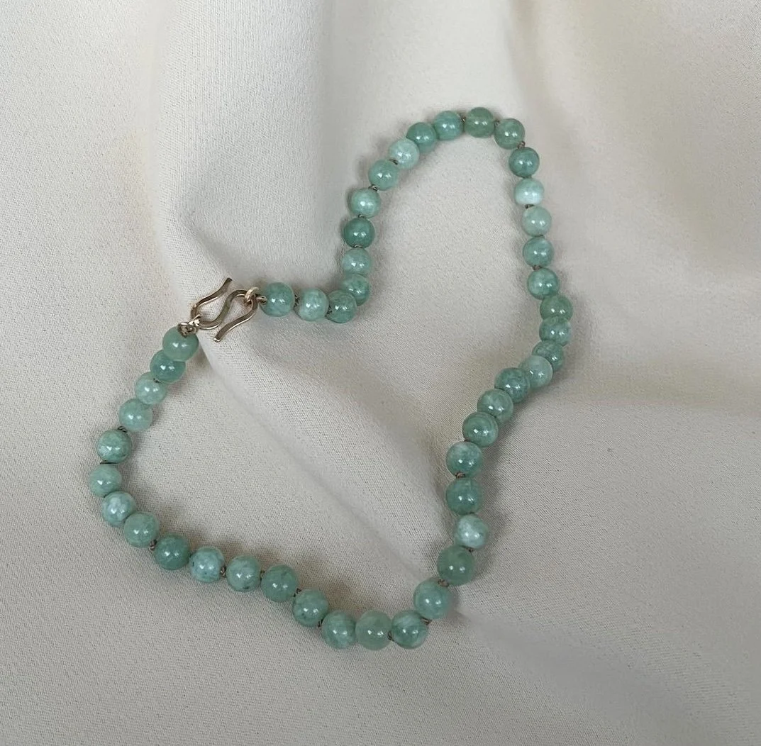 Jade necklace with big s-lock in 14 karat solid gold.